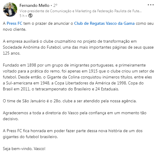 Informação curtinha: A 777 Partners contratou a agência Press FC p/ trabalhar com o Vasco na comunicação sobre a SAF. Entre os trabalhos que a agência vai fazer está "treinar" os porta-vozes do clube e da própria 777 p/ falar sobre a SAF. Post do fundador da Press FC 👇 #VascoENM