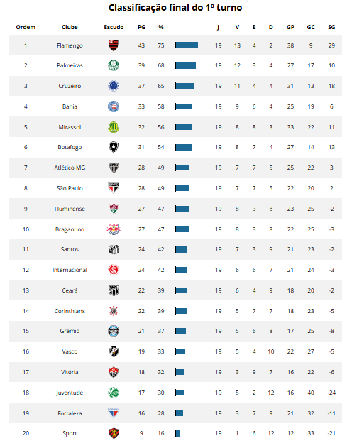 Relembre abaixo a classificação do primeiro turno do campeonato e compare o desempenho das equipes na primeira e na segunda metade da competição.