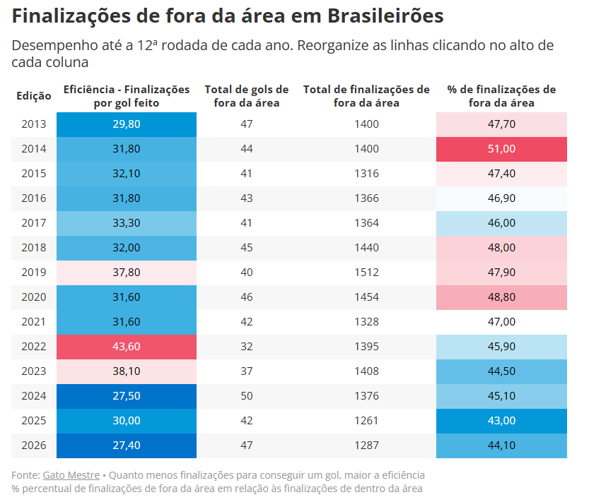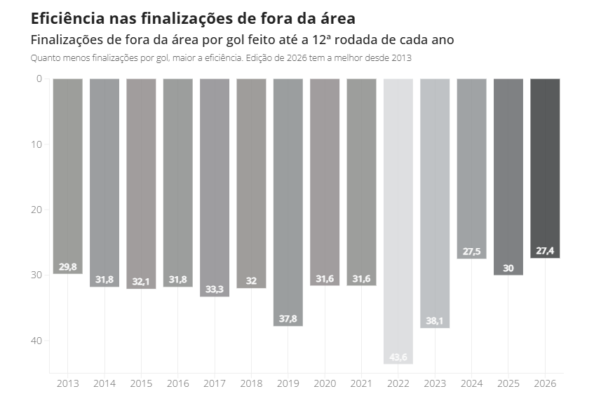 O Brasileirão deste ano começou com a maior eficiência em finalizações de fora da área desde 2013, quando o Gato Mestre começou a coletar dados da Série A. Nesta edição os atletas da elite nacional conseguiram um gol a cada 27,3 finalizações de longe.