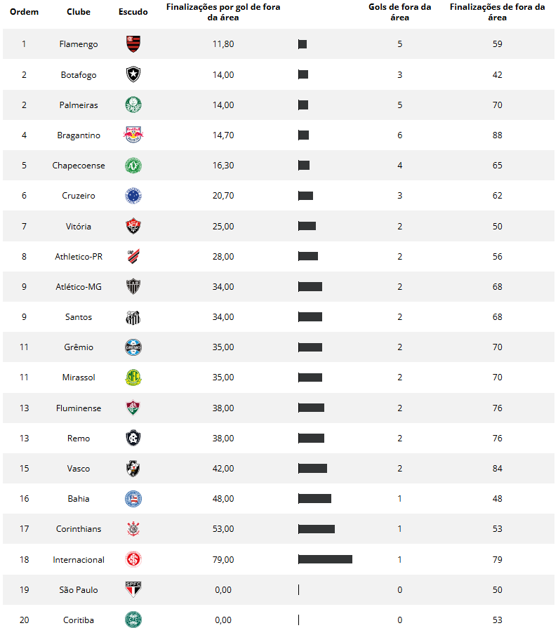 Entre as equipes, o Flamengo está com a maior eficiência em finalizações de fora da área. Foram cinco gols marcados em 59 conclusões de longe, um gol a cada 11,8 tentativas. Coritiba e São Paulo não fizeram gol de longe e, por isso, são consideradas as mais ineficientes.