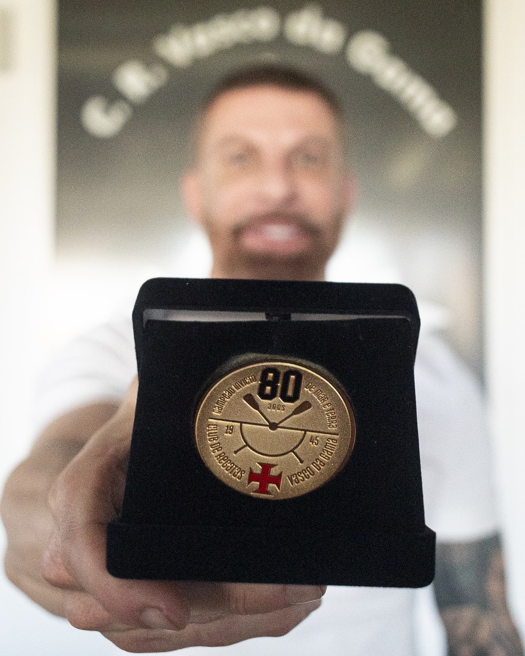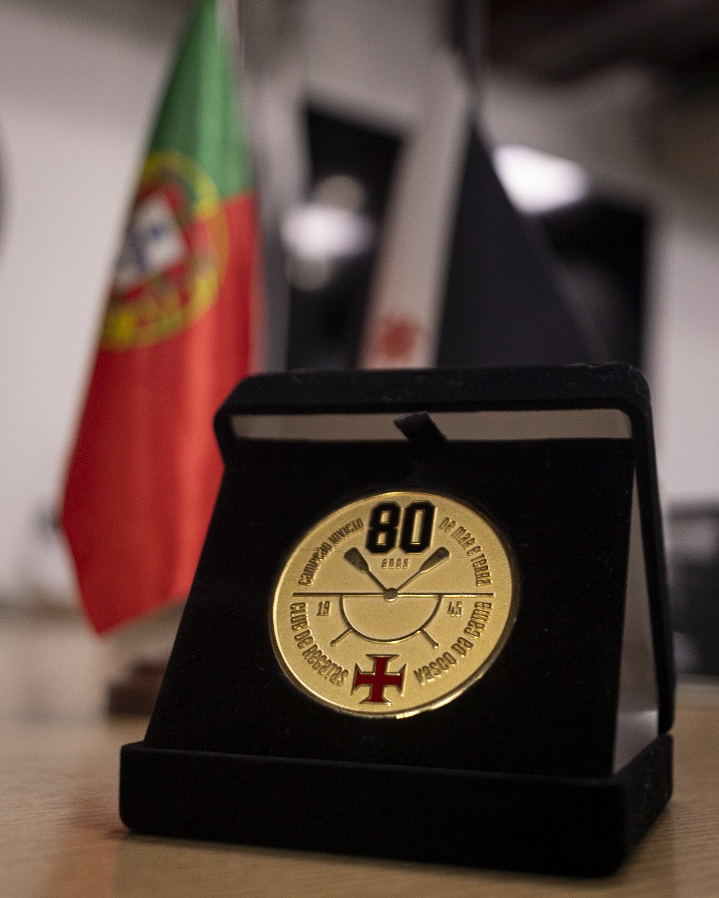 Já está disponível a medalha comemorativa dos 80 anos da conquista invicta de Mar e Terra, uma homenagem ao feito de 1945, quando o Vasco foi Campeão Invicto de Remo e Futebol.