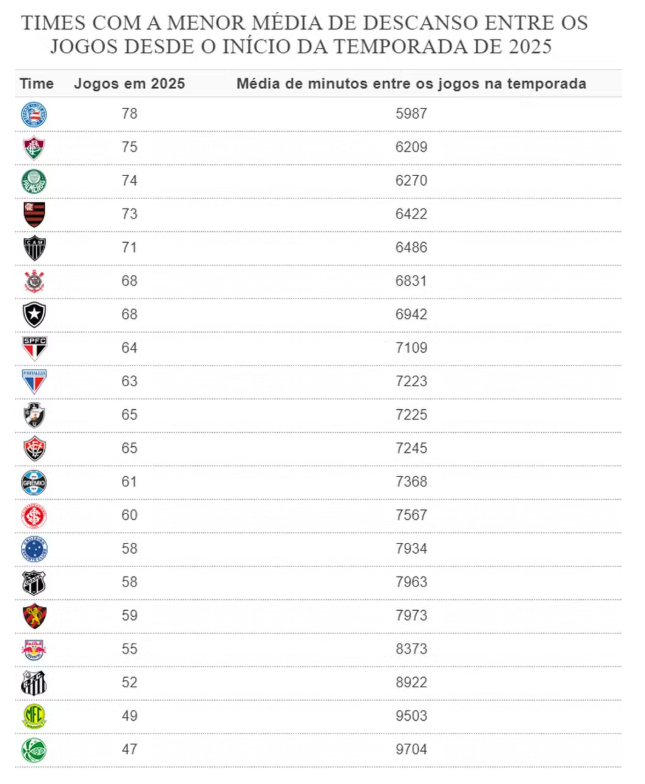 O Bahia é a equipe com menor média de descanso (5987 minutos entre os jogos).