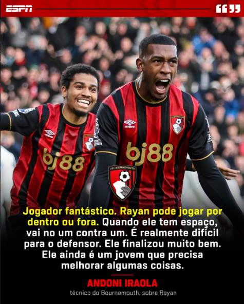 Andoni Iraola não economizou palavras ao falar sobre Rayan. Para o técnico do Bournemouth, o jovem é um jogador fantástico, versátil, e difícil de ser marcado quando tem espaço. Apesar dos elogios, Iraola reforça que o talento ainda pode evoluir em alguns aspectos.