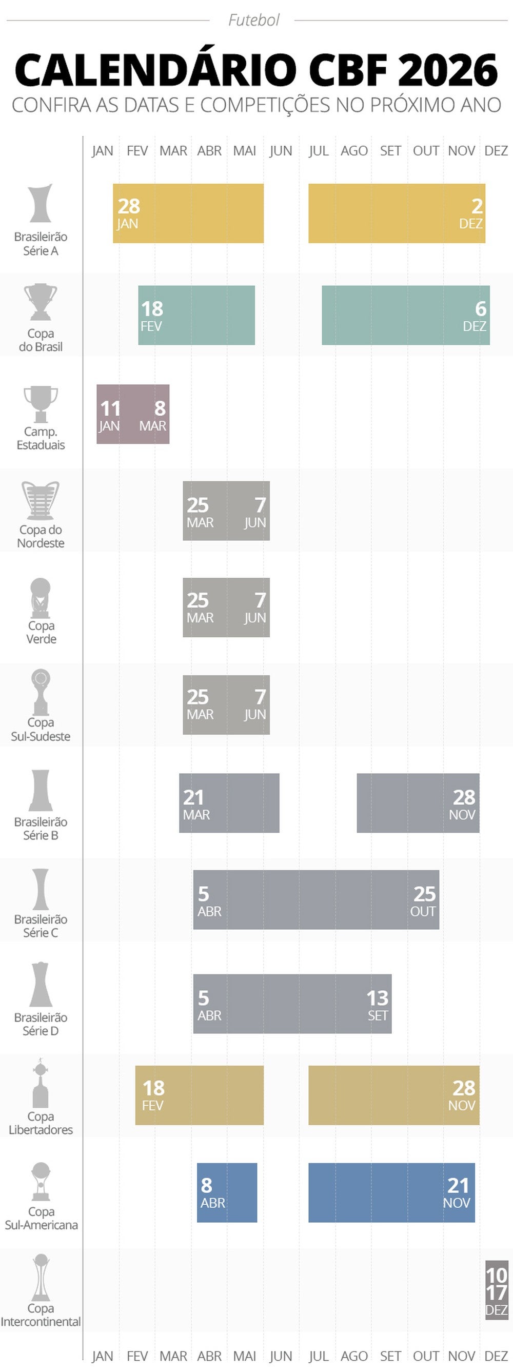 Com muitas mudanças, a CBF divulgou, nesta quarta-feira, o calendário do futebol brasileiro para o período de 2026 a 2029. Entre as principais alterações estão a diminuição de datas para os estaduais, o aumento da duração do Campeonato Brasileiro, o novo formato da Copa do Brasil e a criação de torneios regionais, como a Copa Sul-Sudeste, a Copa Centro-Oeste e a volta da Copa Norte.