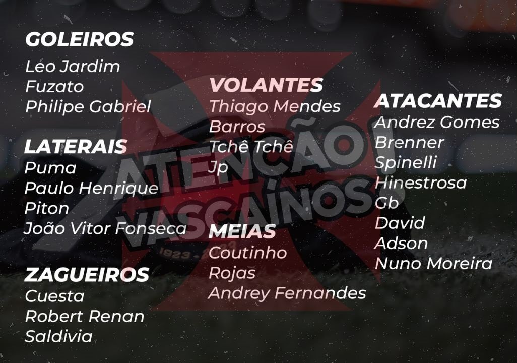 Confira a lista completa dos jogadores relacionados para Vasco x Bahia. Como informamos, Cuiabano fica fora por controle de carga. Já Spinelli bidou hoje e vai pro jogo.