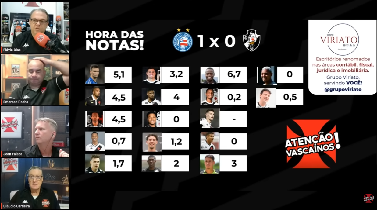 Canal Atenção Vascaínos avaliou a atuação dos jogadores contra o Bahia, na derrota por 1 a 0, na Arena Fonte Nova, no último domingo (23). David e Mateus Carvalho receberam nota zero.