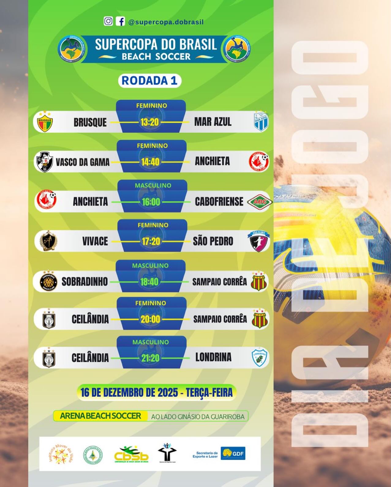A Rodada 1 da Supercopa do Brasil de Beach Soccer vem com uma sequência intensa de grandes confrontos, do feminino ao masculino, reunindo equipes de todo o país 🏖️⚽