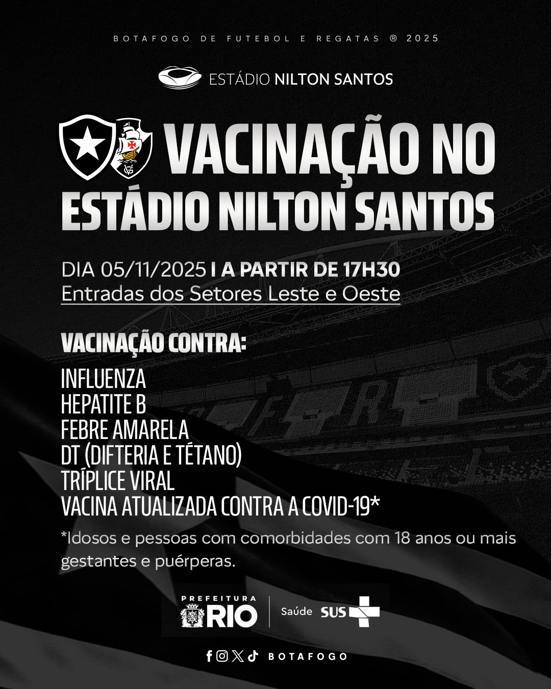 A partir das 17h30 nesta quarta-feira (05), torcedores poderão ser vacinados contra Influenza, Hepatite B, Febre Amarela, DT, Tríplice Viral e COVID-19 nas entradas dos setores Leste e Oeste do Estádio Nilton Santos. Fique atento às informações! 💪🏽🌟 #BFR