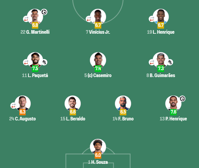 Pouco depois, na primeira boa investida do Brasil, saiu o primeiro. Bruno Guimarães achou lindo passe para Paulo Henrique, que saiu na cara do goleiro e tocou para fazer 1 a 0. Não demorou muito para sair o segundo. Aos 31 minutos, Paquetá cavou na entrada da área para Martinelli finalizar e fazer 2 a 0.