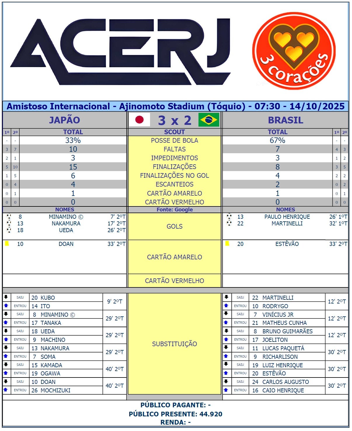 Scout Final de Japão e Brasil em jogo amistoso de preparação para a Copa do Mundo de 2026 no Ajinomoto Stadium de Tóquio (Fonte: Google) #Acerjinforma #JAPxBRA @JFA @jfa_samuraiblue @CBF_Futebol