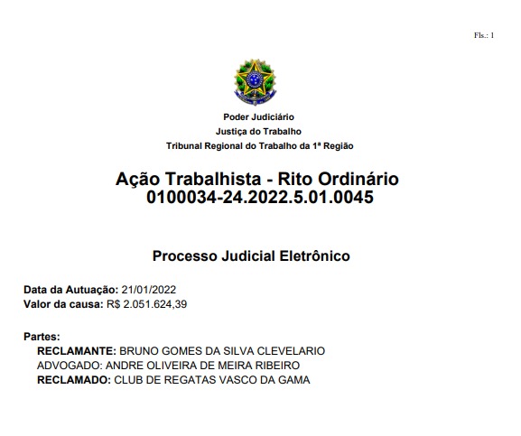 Bruno Gomes acionou o Vasco da Gama na Justiça do Trabalho cobrando R$ 2 milhões.