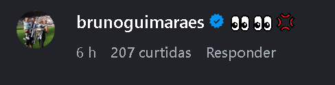 Bruno Guimarães comenta "👀👀💢" em publicação do Vasco antes do jogo contra o Remo começar. A foto aparecia o jogador com a camisa da Seleção Brasileira e, logo na frente, a do Thiago Mendes.