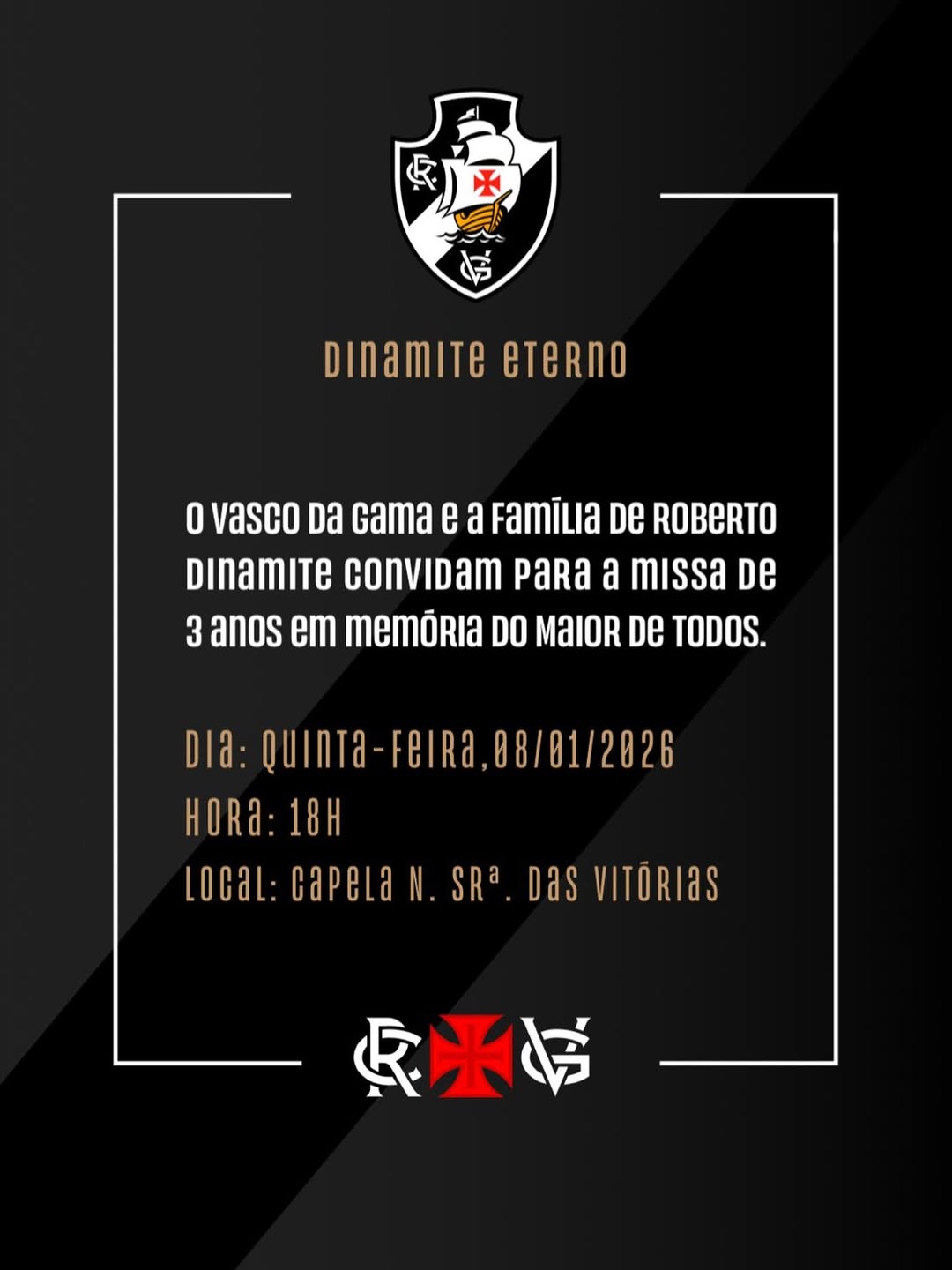 Nesta quinta-feira, 08/01, às 18h, haverá uma missa em memória de Roberto Dinamite, na Capela N. Srª. das Vitórias, em São Januário. A celebração será aberta à torcida.