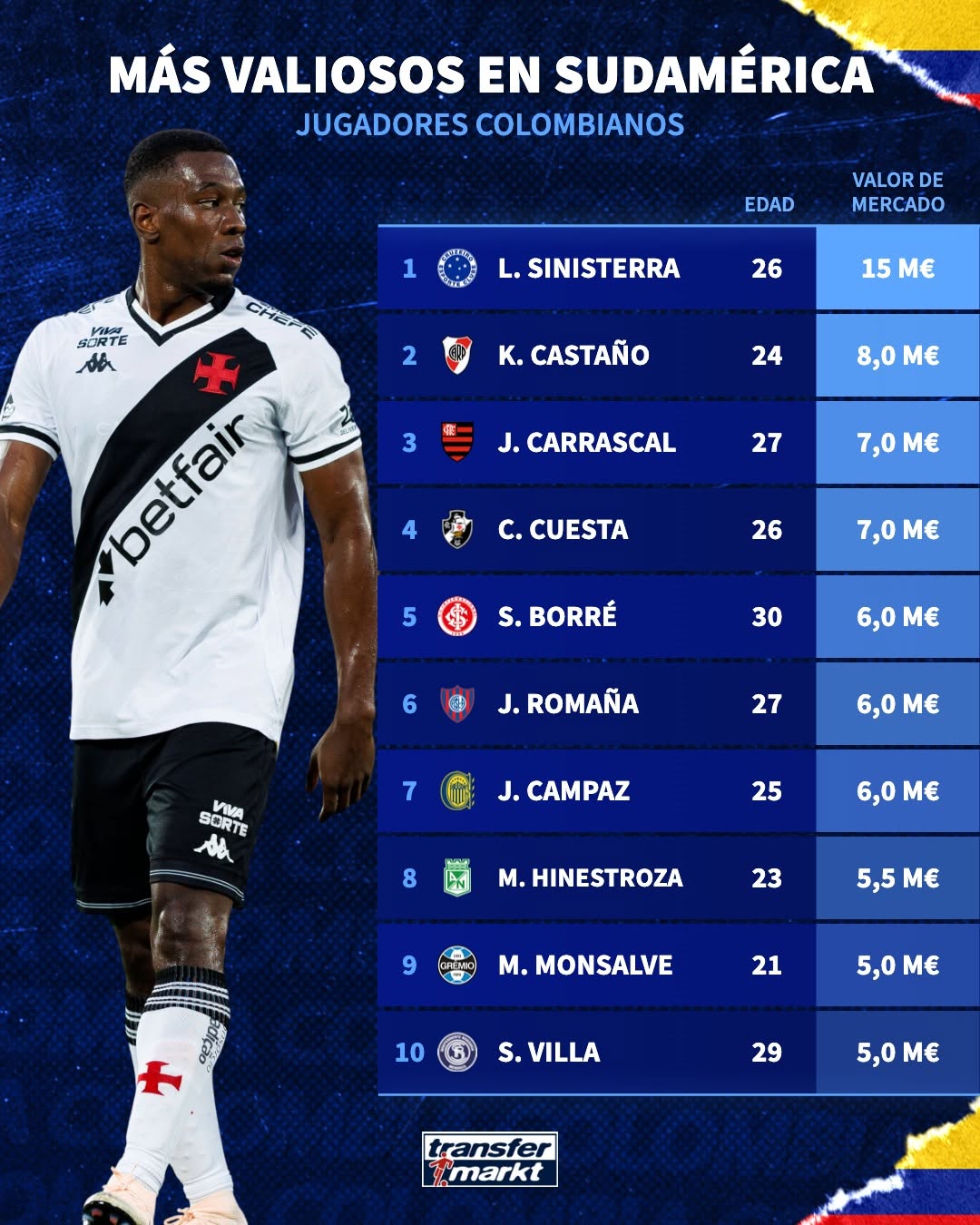 🚨 Carlos Cuesta é o 4º jogador colombiano mais valioso jogando na América do Sul.