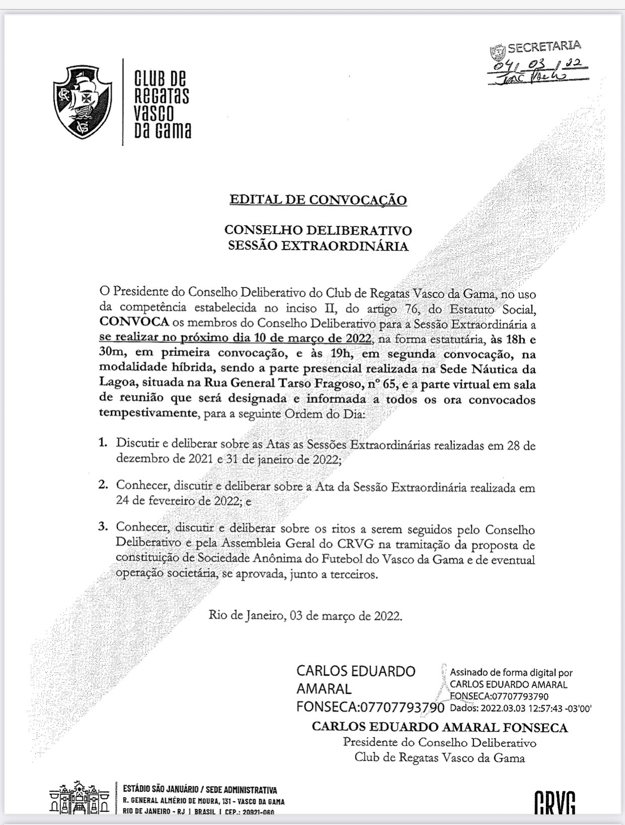 Presidente do Conselho Deliberativo do Vasco, Carlos Fonseca convoca sessão extraordinária para próximo dia 10 com intuito de conhecer, deliberar e discutir sobre os ritos a serem seguidos pelo órgão e pela Assembleia Geral visando a tramitação da proposta de constituição da SAF