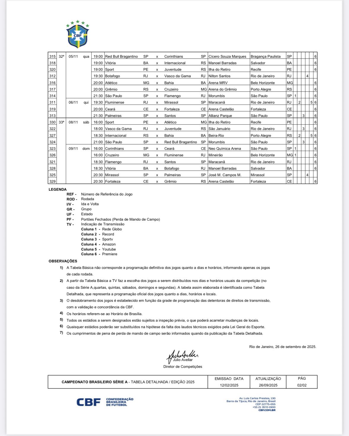 CBF detalha rodadas 28 a 33 do Campeonato Brasileiro