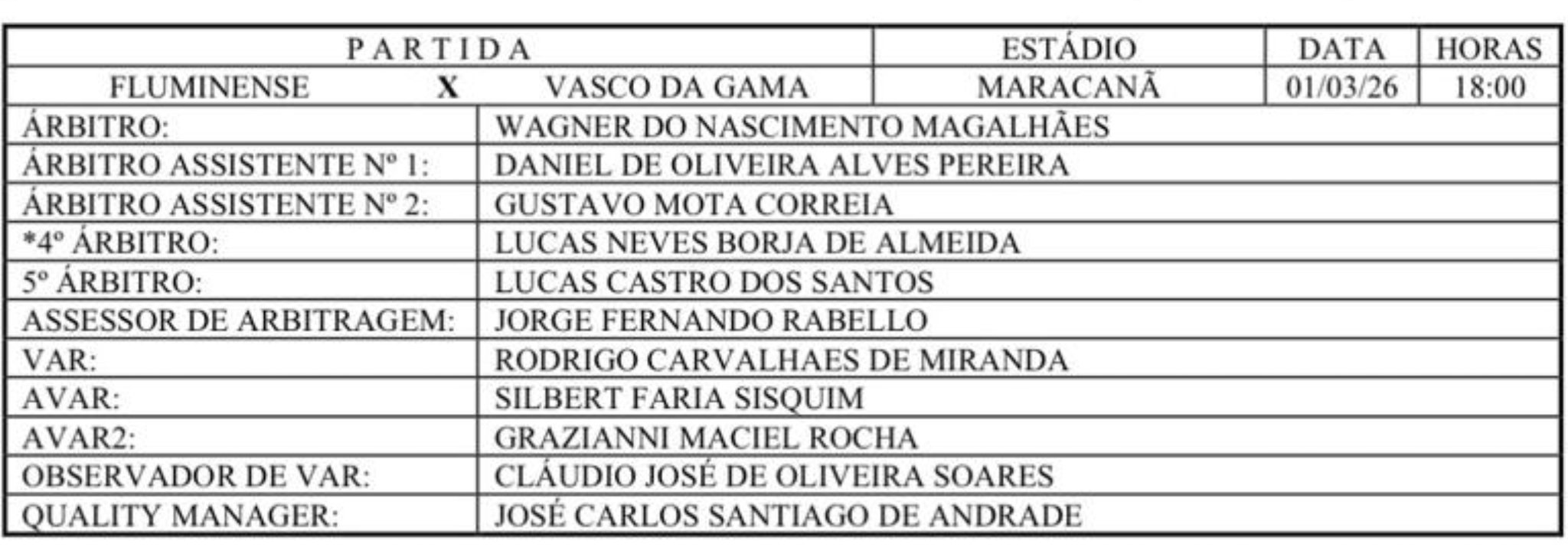 A FERJ acaba de divulgar a escala de arbitragem para as semifinais do Campeonato Carioca. Para o jogo da volta entre Vasco e Fluminense, o árbitro escolhido foi Wagner do Nascimento Magalhães. No VAR, estará Rodrigo Carvalhaes de Miranda. Confira: