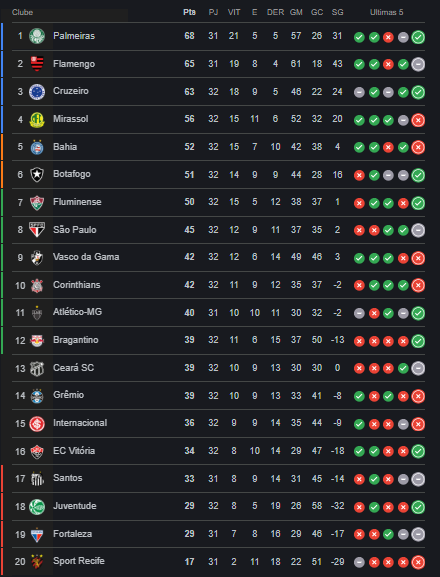 Classificação do Brasileirão após o encerramento da 32ª rodada