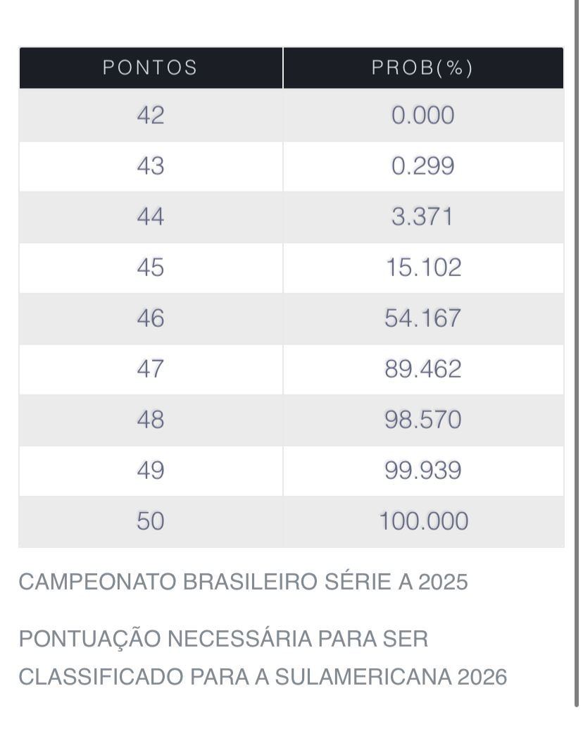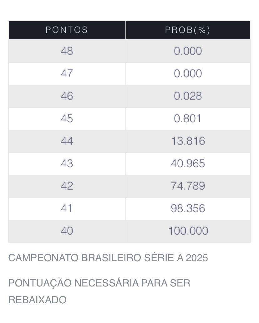 Como era de se esperar, as chances de rebaixamento beiram o nulo com 45 pontos. O Vasco está salvo. Porém, precisa vencer mais um jogo para (quase) garantir vaga na Sul-Americana. Feito isso, foco na Copa do Brasil.