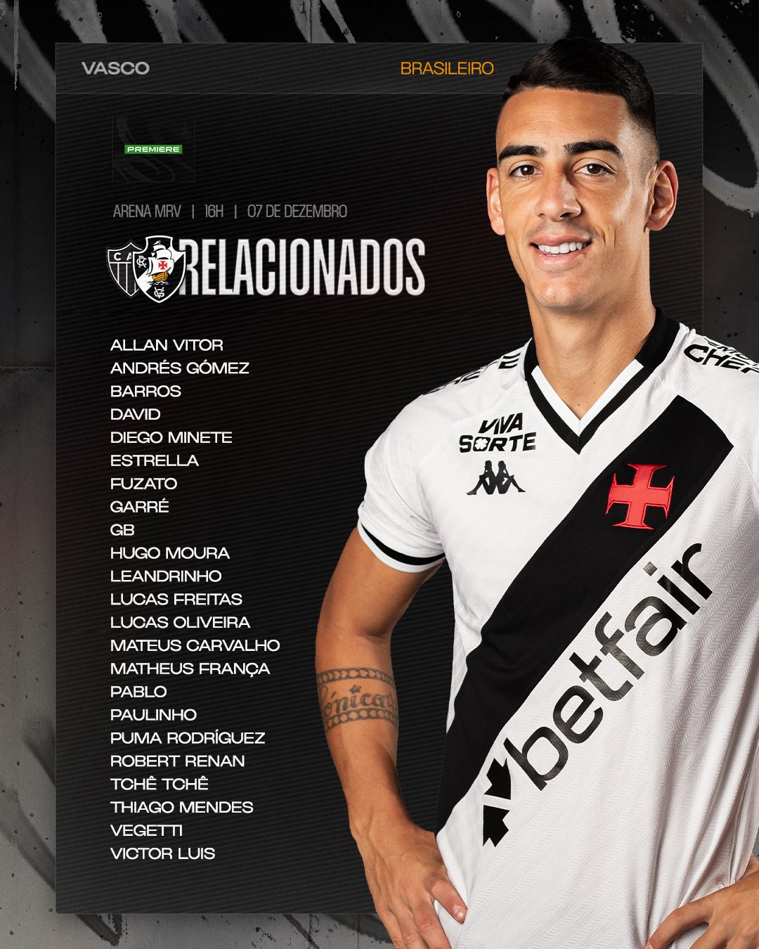 O Vasco vai para Belo Horizonte com esses jogadores para encarar o Atlético-MG, neste domingo, às 16h, na Arena MRV. Dos titulares, o técnico Fernando Diniz deixa no Rio: Léo Jardim, PH, Cuesta (suspenso), Coutinho, Rayan e Nuno Moreira. Confira: