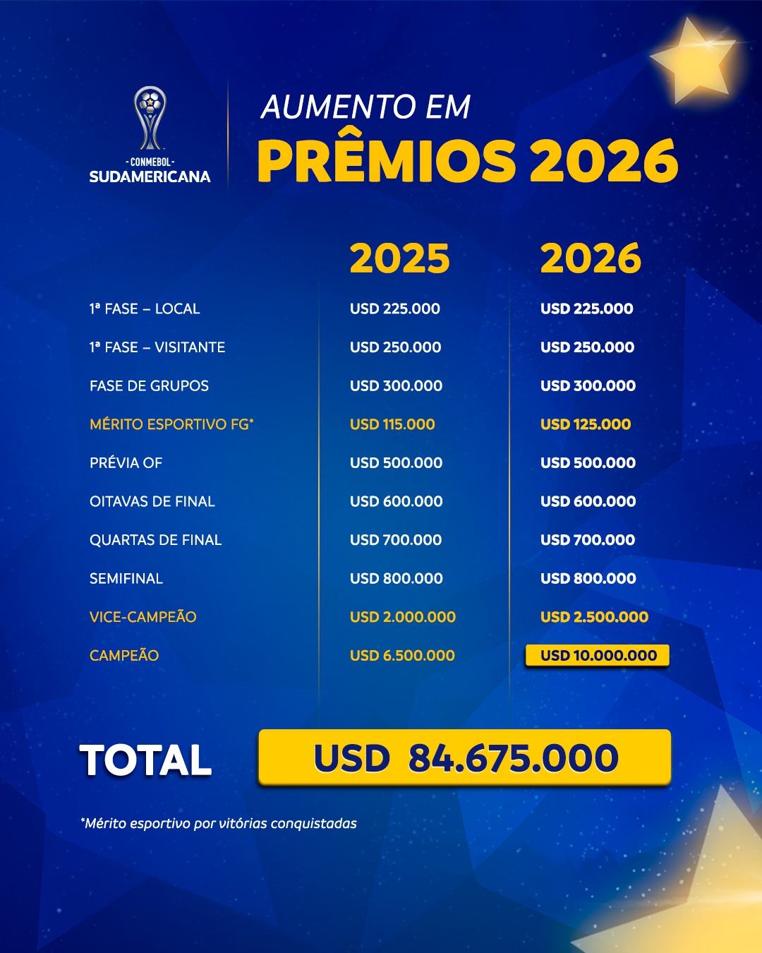 A @SudamericanaBR anuncia um aumento na premiação da Copa Sul-americana desse ano em comparação a 2025. Confira os valores atuais: