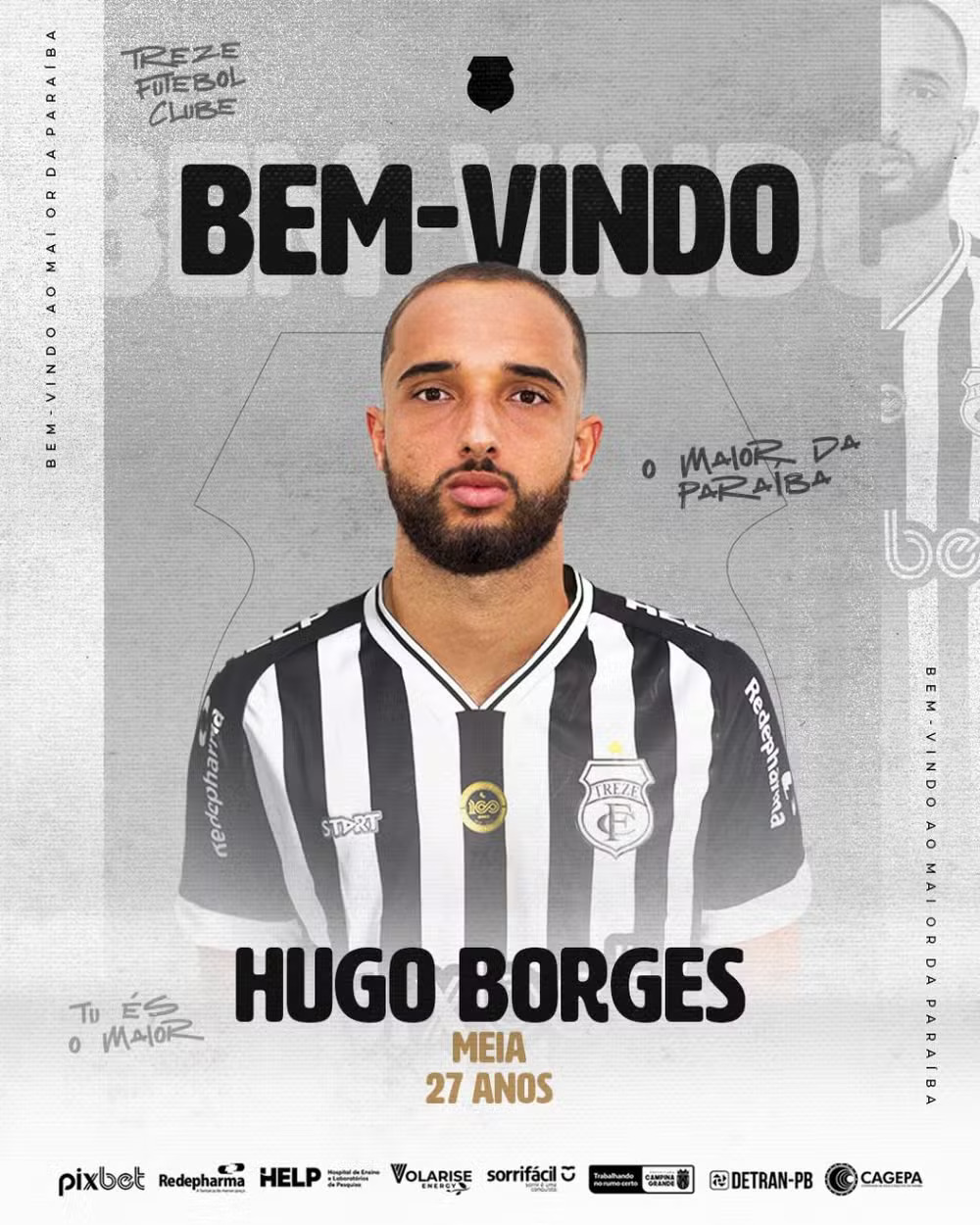 O Treze anunciou na noite dessa quarta-feira (22) a contratação do meia Hugo Borges. Formado nas categorias de base do Vasco, o atleta passou seis anos no Cruzmaltino e é o 2º reforço confirmado para o elenco do técnico Roberto Fernandes.