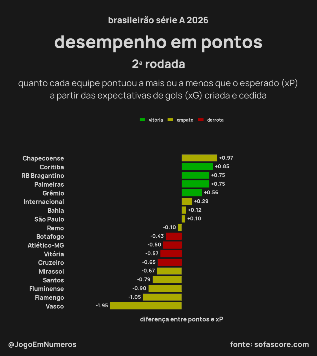 Diferença entre pontos e expectativa de pontos (xP)* e resultado conquistado (V | E | D):