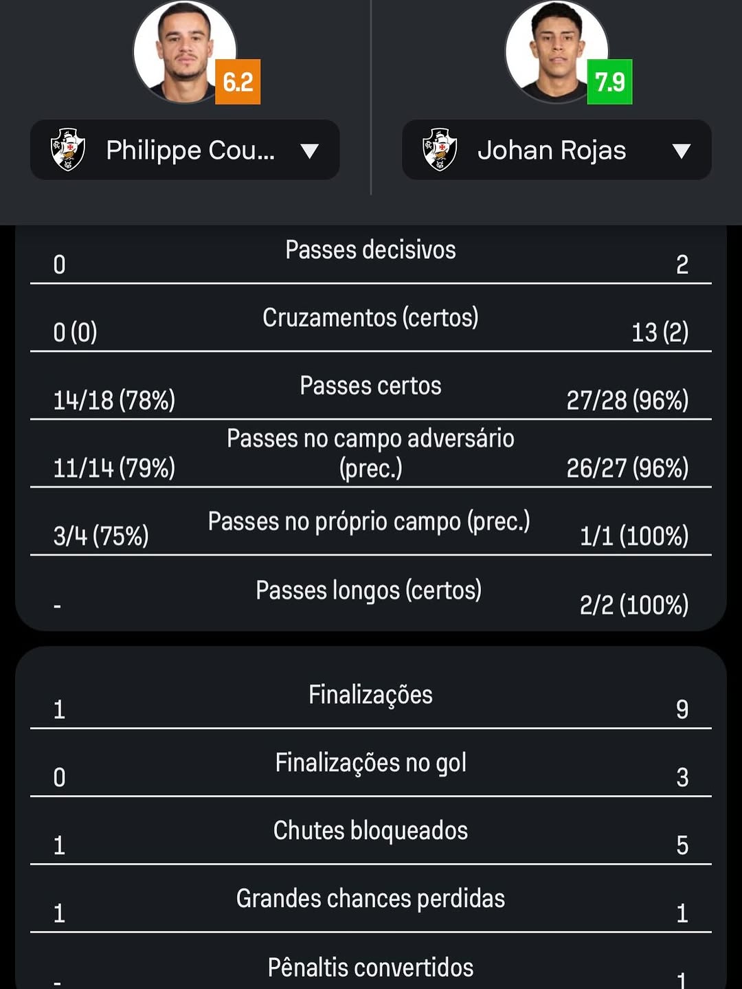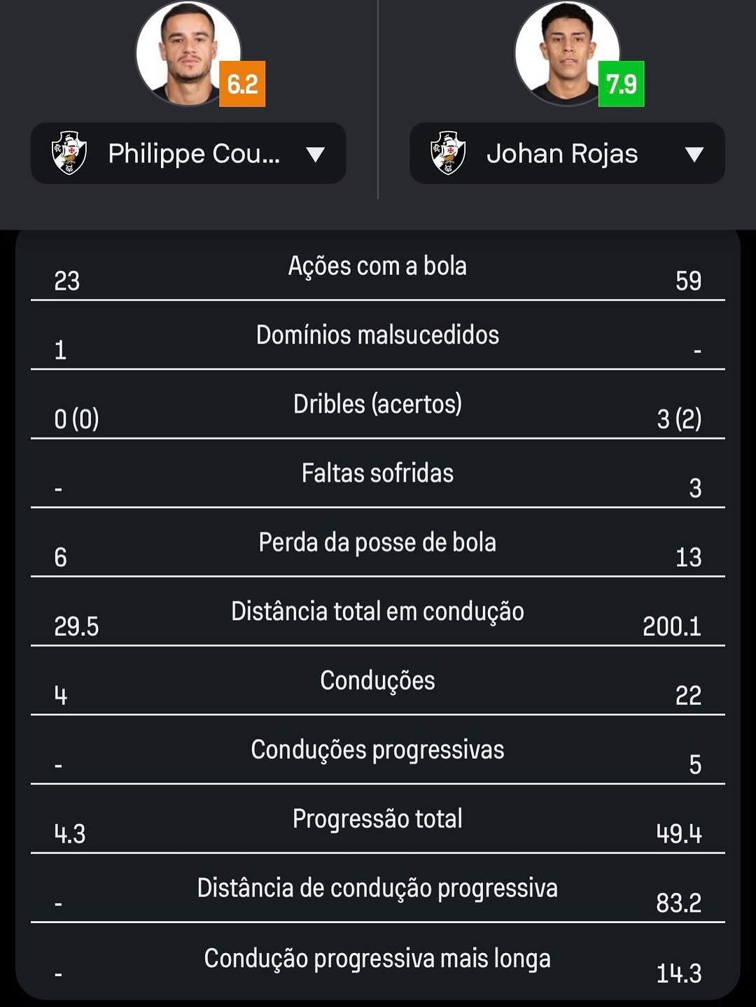 Impressionante a diferença no volume de jogo do Rojas para o Philippe Coutinho. 45 minutos de jogo para cada um, mesmo adversário, praticamente os mesmos companheiros, mesmo gramado… A única diferença era o contexto do jogo, com Rojas entrando com o Vasco já perdendo e o Volta Redonda mais recuado e cansado. Mas Coutinho também teve a chance de gerar esse volume no primeiro tempo, após o gol, e não conseguiu.