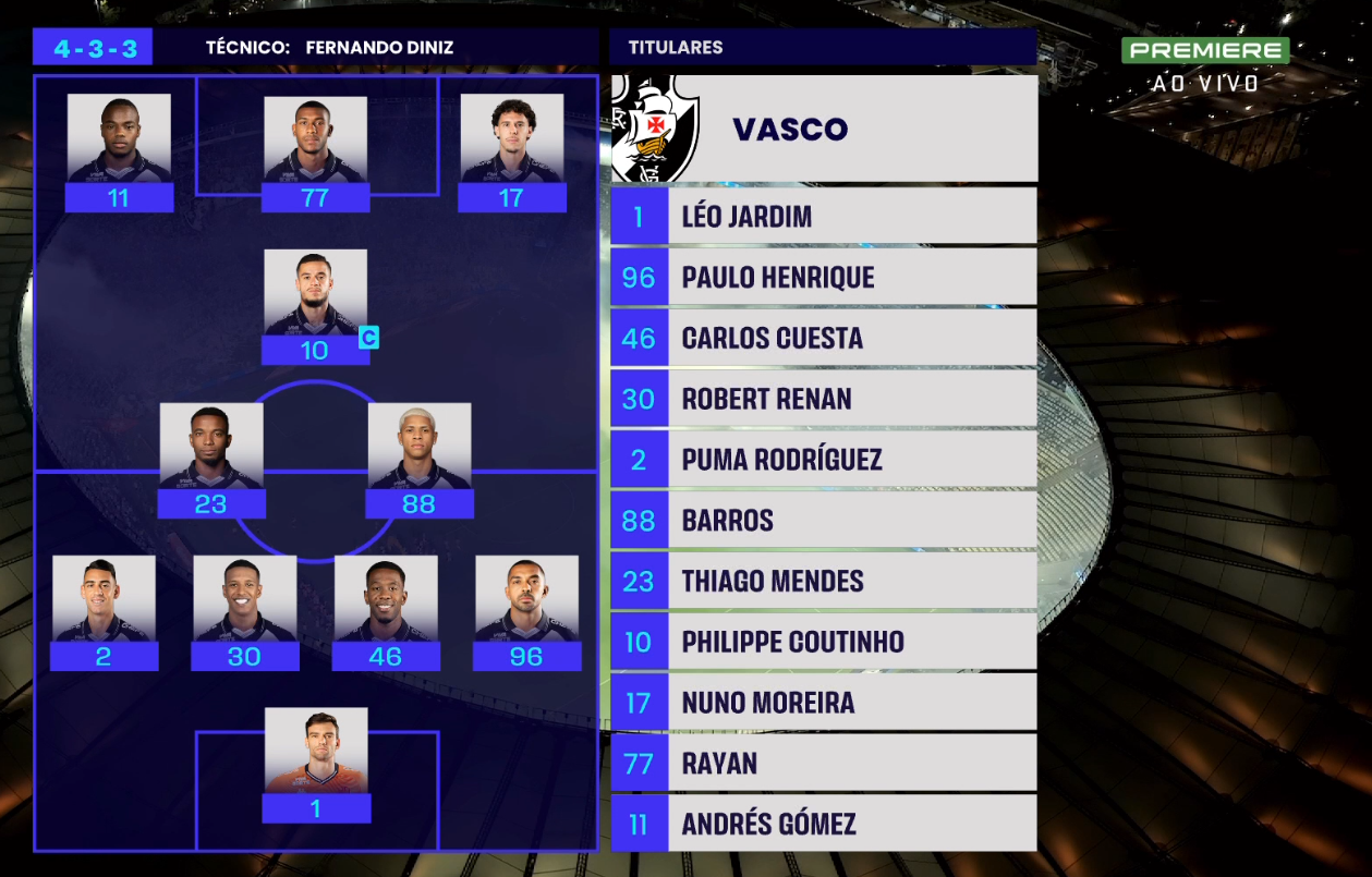 Fernando Diniz escala o Vasco no esquema 4-3-3, para enfrentar o Fluminense, nesta quinta (11), pelo jogo de ida da semifinal da Copa do Brasil.