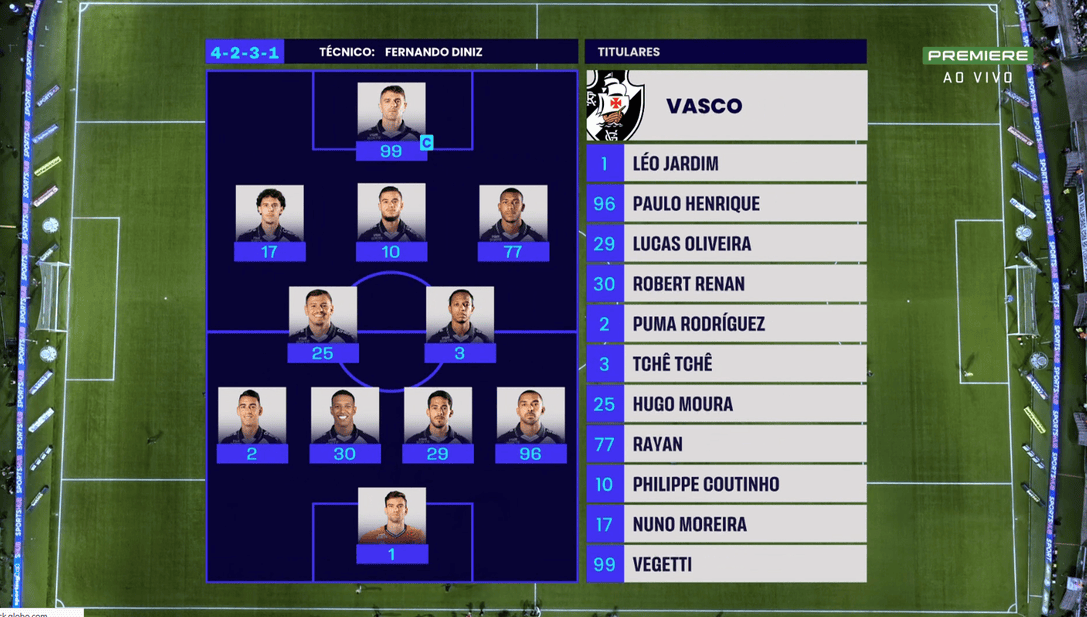 Fernando Diniz escala o Vasco no esquema 4-2-3-1 para enfrentar o Palmeiras, nesta quarta (01), pelo Brasileiro, fora de casa.