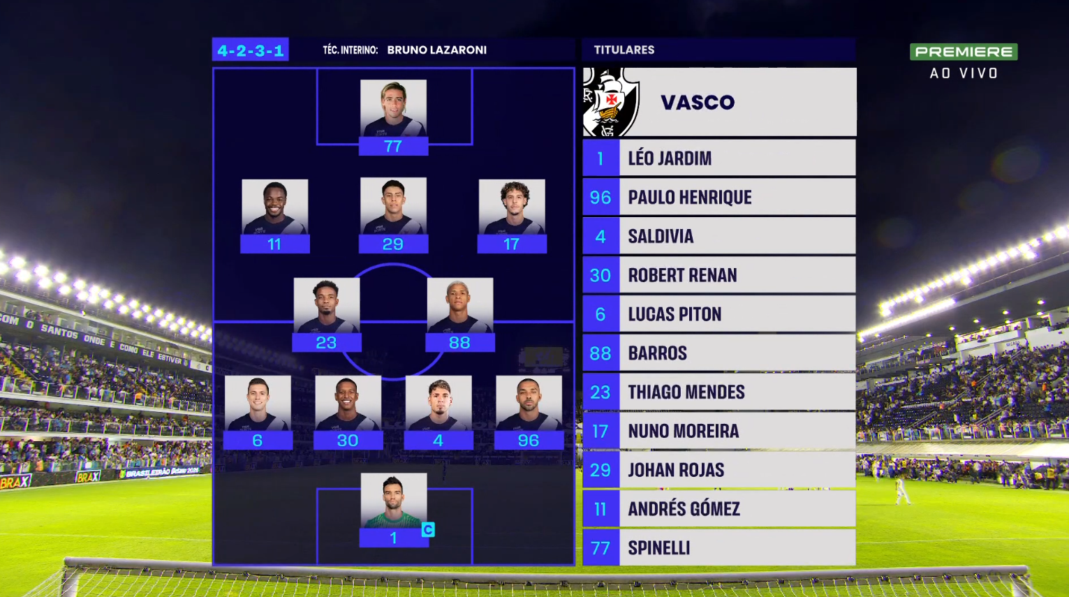 Bruno Lazaroni escalou o Vasco no esquema 4-2-3-1 para o duelo contra o Santos, nesta quinta (19), pelo Brasileiro.