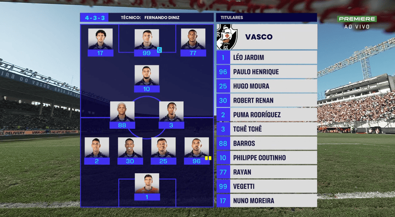 Fernando Diniz escala o Vasco no esquema 4-3-3 para enfrentar o Vitória, neste domingo (05), pelo Brasileirão.