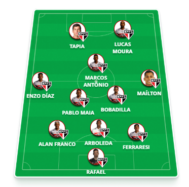 Provável escalação: Rafael, Alan Franco, Arboleda e Ferraresi; Maílton, Pablo Maia, Bobadilla, Marcos Antônio e Enzo Díaz; Lucas Moura e Tapia.