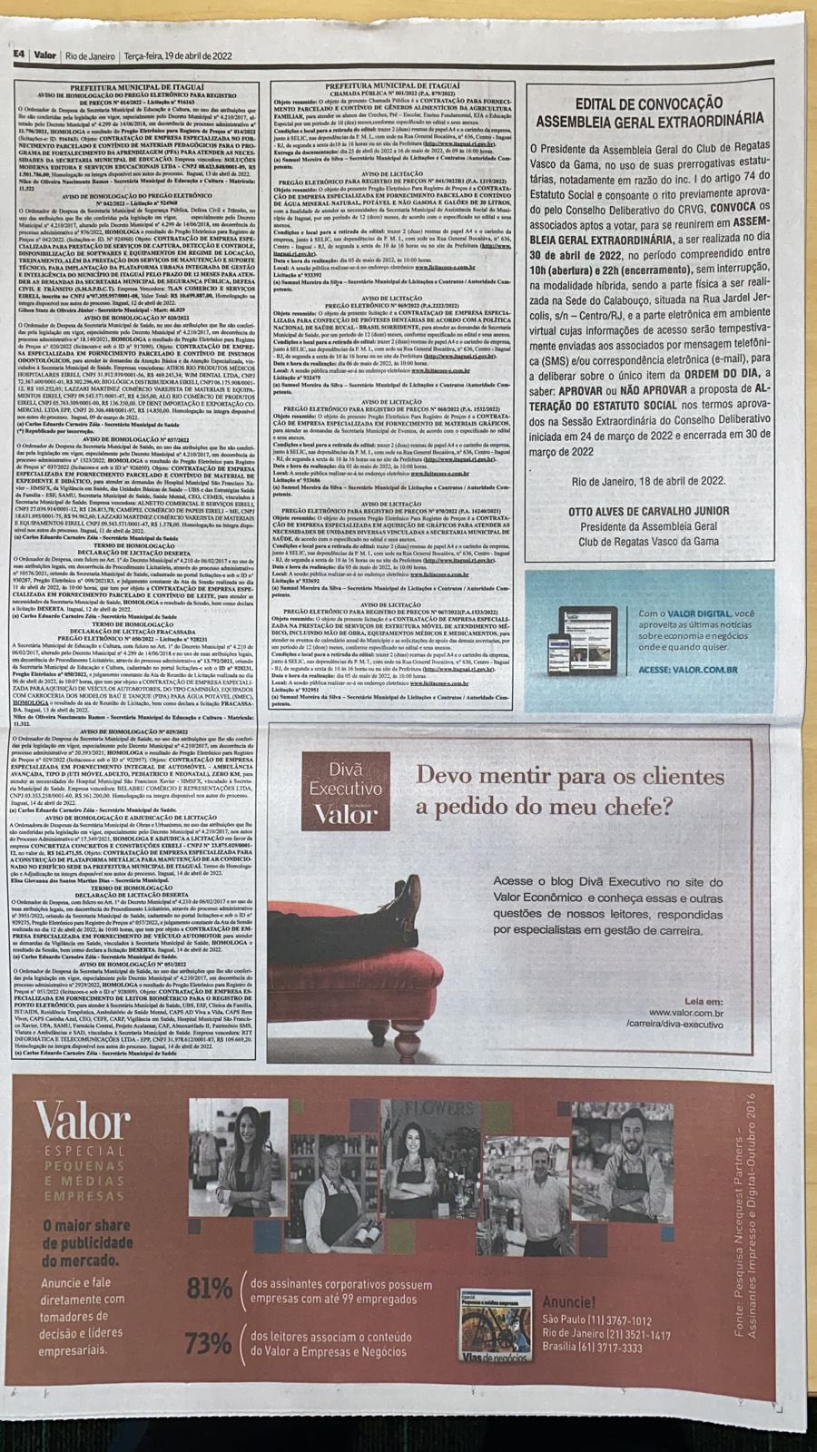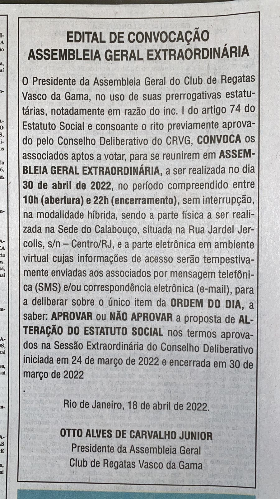 Como orienta o Estatuto, edital de convocação da AGE publicado em jornais de grande circulação: Valor Econômico, O Dia e Monitor Mercantil.