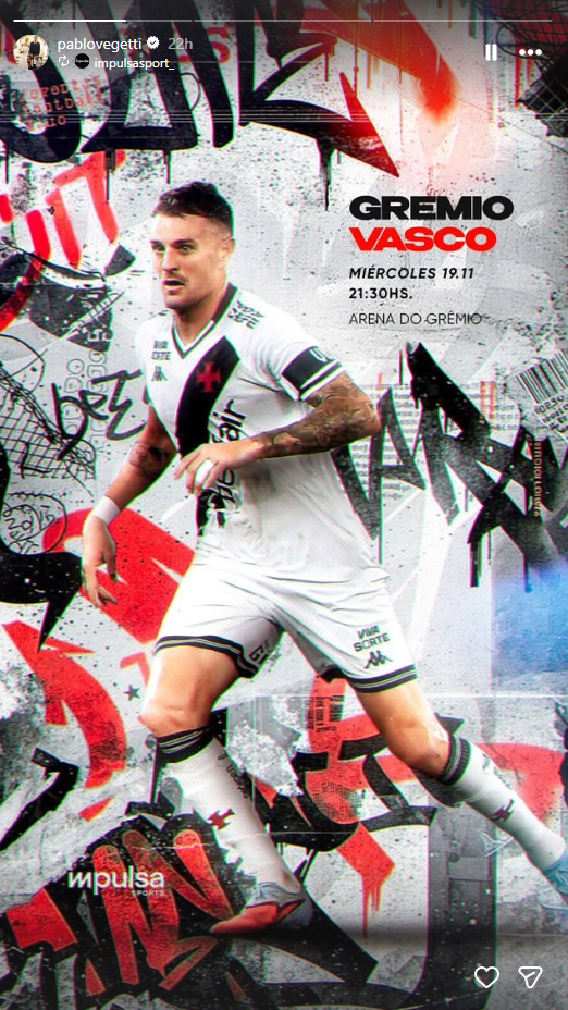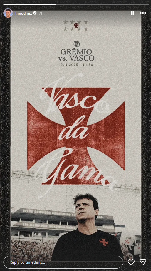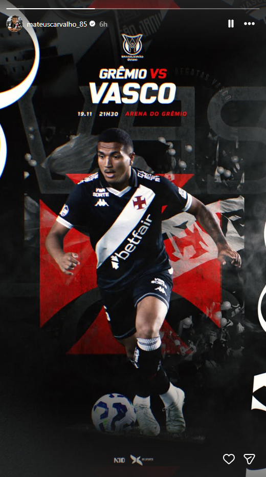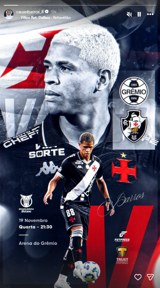 Jogadores do Vasco publicam imagens destacando o duelo contra o Grêmio, pela rodada 34 do Brasileirão, nesta quarta (19), às 21h30, na Arena do Grêmio. O confronto terá transmissão da TV Globo.