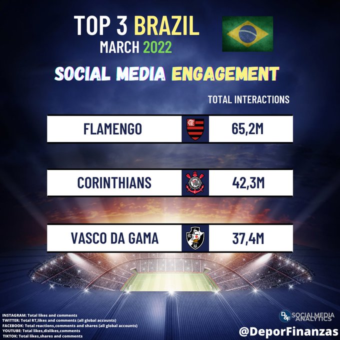 📲⚽🇧🇷 Os 3 clubes brasileiros com mais engajamento nas redes sociais durante março 2022!