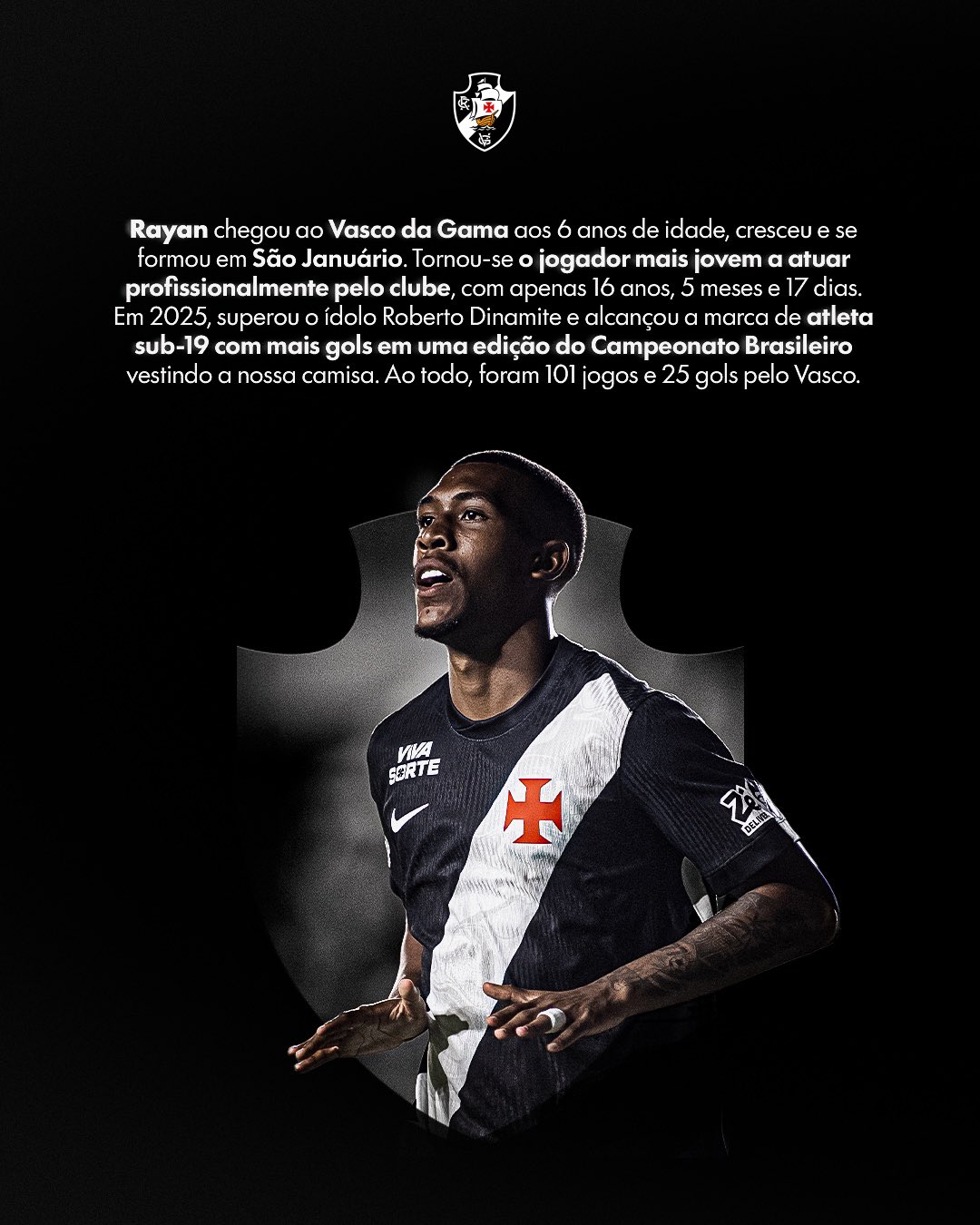 Rayan chegou ao Gigante aos 6 anos de idade. Em São Januário, cresceu e se formou como atleta e como ser humano, carregando no peito a Cruz de Malta.