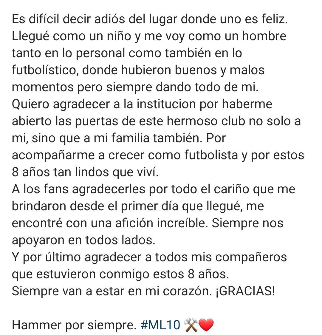 Lanzini se despede do West Ham, em publicação no Instagram. lanzini, reprodução/instagram