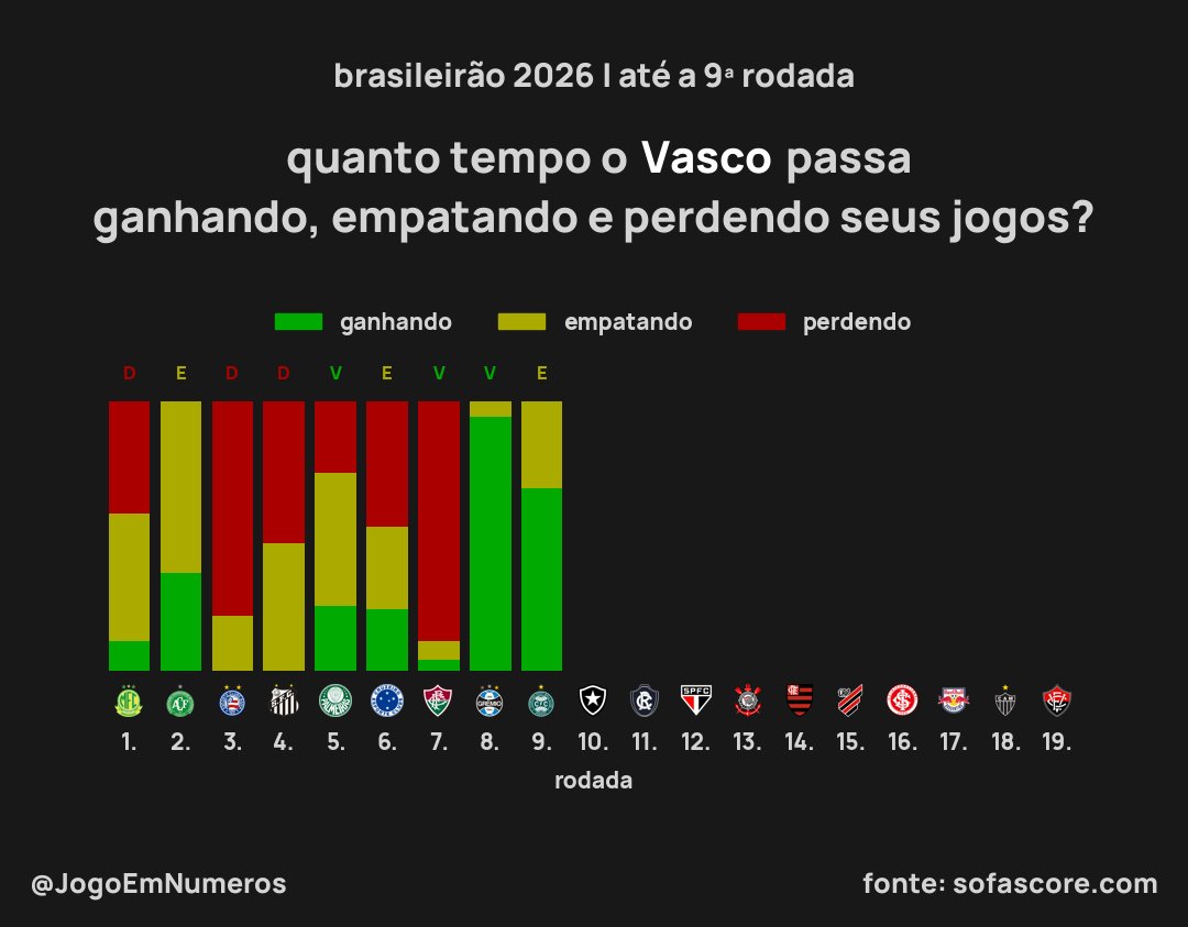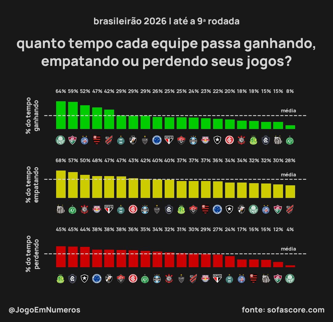 ⏲️ Quanto tempo cada time passa ganhando, empatando ou perdendo seus jogos? No fio, o detalhe por jogo de cada time! 🧶...