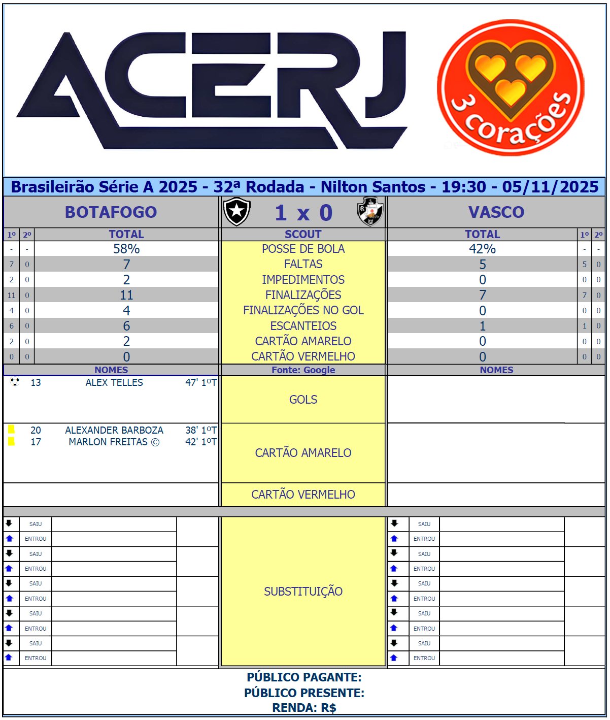 Scout do 1º Tempo de Botafogo e Vasco pela 32ª Rodada do Campeonato Brasileiro 2025 no Nilton Santos (Fonte: Google)