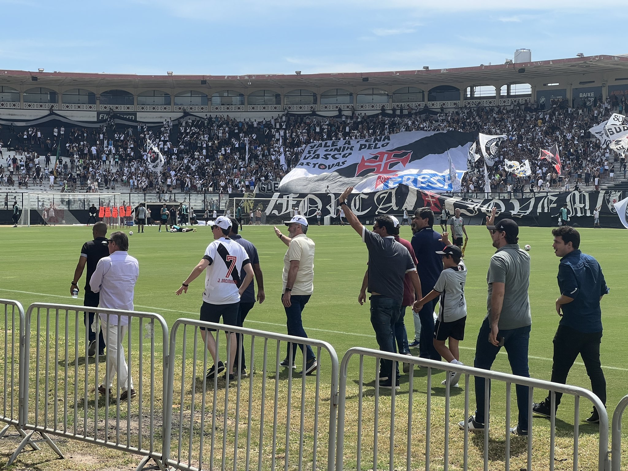 Executivos da 777 Partners presentes em São Januário para treino aberto saudando a torcida. Escutei alguns gritos de: agora somos ricos!