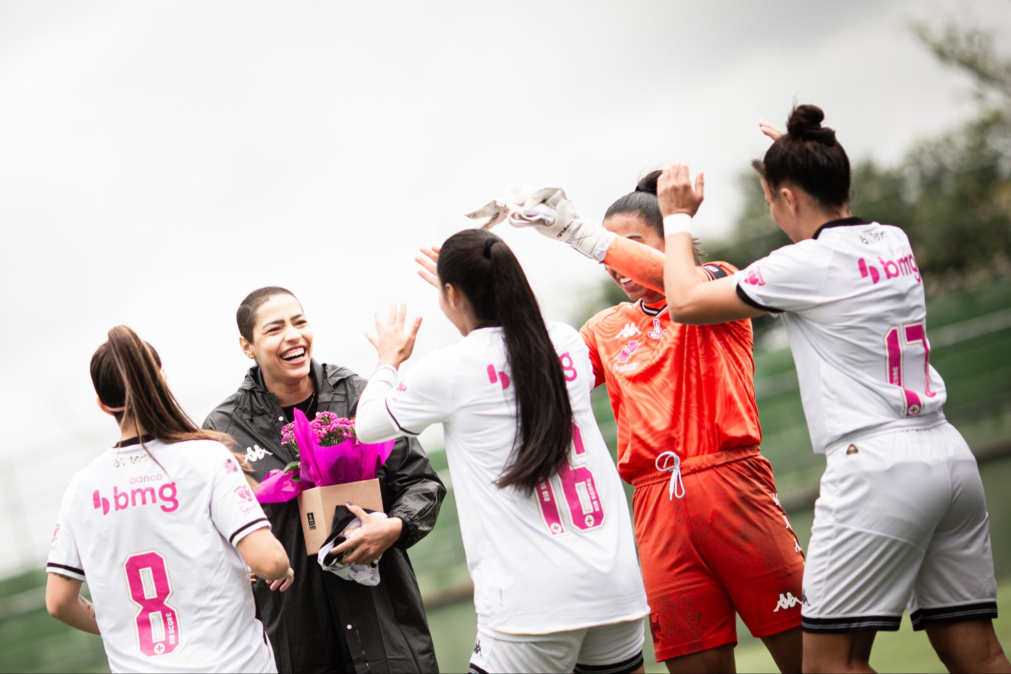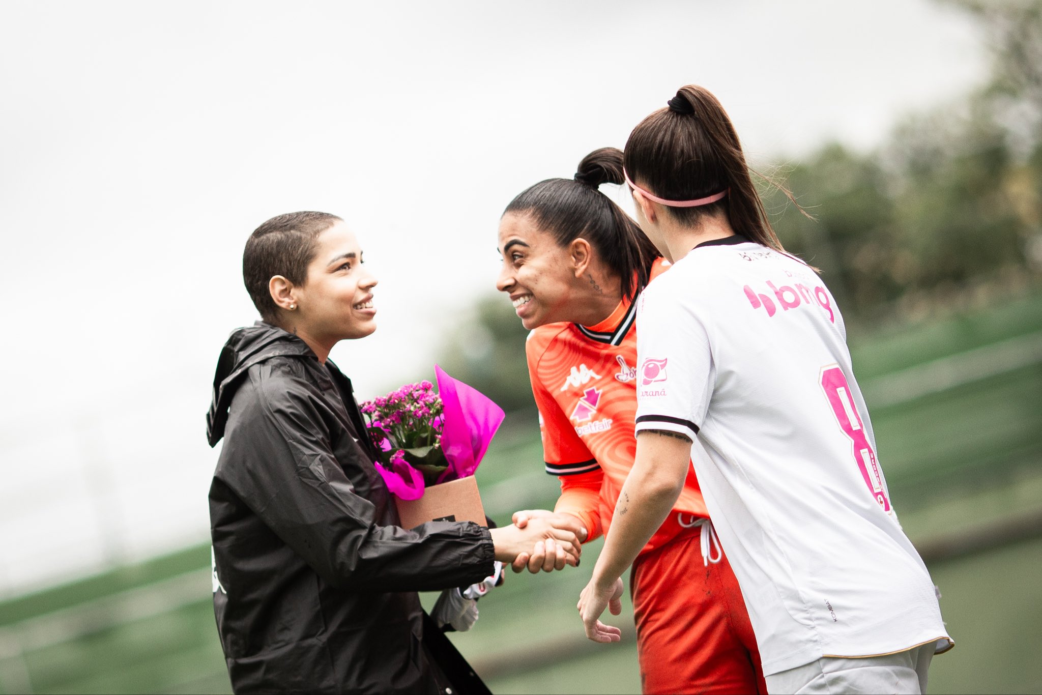 Na entrada das equipes em campo, as #MeninasDaColina foram acompanhadas por Julia Peres, que enfrentou um momento desafiador ao descobrir um câncer ainda jovem.