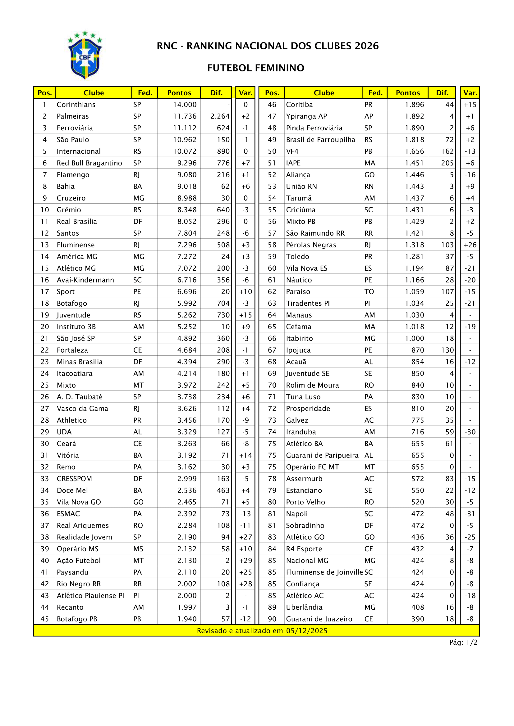 A CBF divulgou nesta quinta-feira (4) o Ranking Nacional de Clubes e de Federações do futebol feminino para 2026, bem como a Convenção de Pontos, documento que orienta a elaboração do ranking. O Corinthians, campeão do Brasileirão A1, é o líder do ranking de clubes, e a Federação Paulista de Futebol (FPF) lidera a tabela de federações.