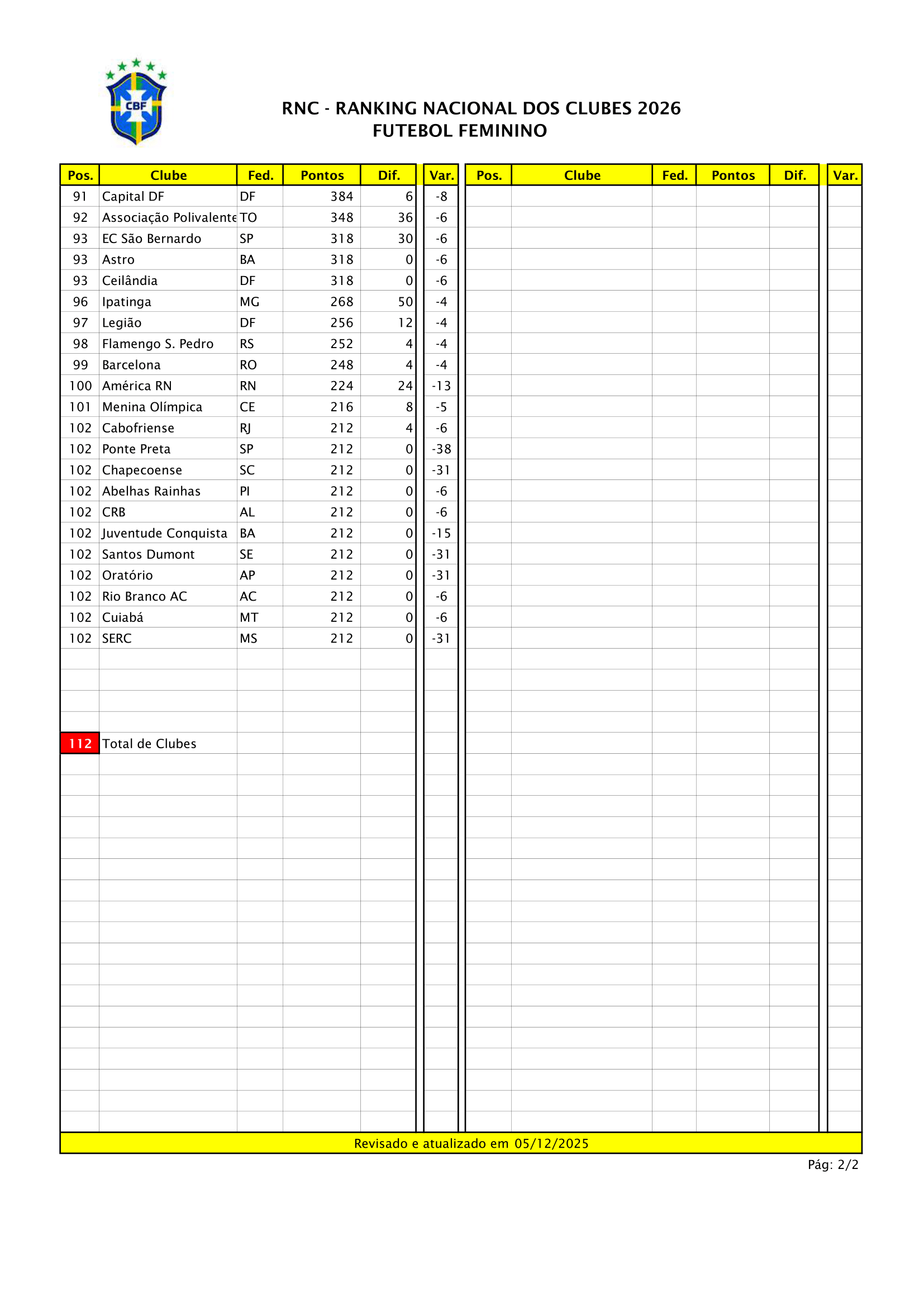 A CBF divulgou ainda a Convenção de Pontos do Ranking Nacional de Clubes, que traz as pontuações relativas a cada uma das competições femininas organizadas pela entidade e os pesos de cada uma delas. Já na temporada 2025, a convenção de pontos foi atualizada e passou a considerar, além dos Brasileiros Feminino A1, A2 e A3, também a Copa do Brasil Feminina no somatório de pontos.