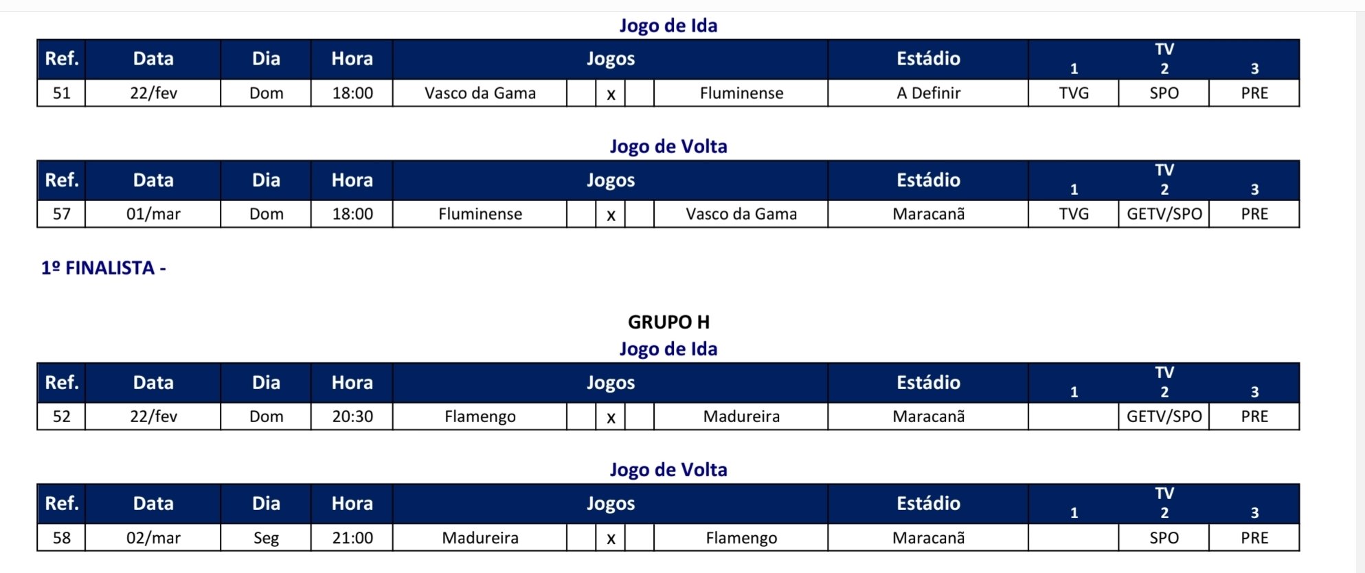 A FERJ divulgou datas e horários das semifinais do Carioca. O primeiro jogo Vasco e Fluminense, será domingo, às 18h. Na publicação está "a definir", mas tem grandes chances de ser no Nilton Santos. Já Flamengo e Madureira jogam também domingo, às 20h, no Maracanã.