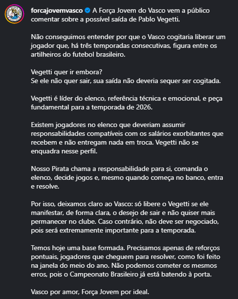 A Força Jovem publicou uma nota contra a liberação de Vegetti por parte do Vasco: