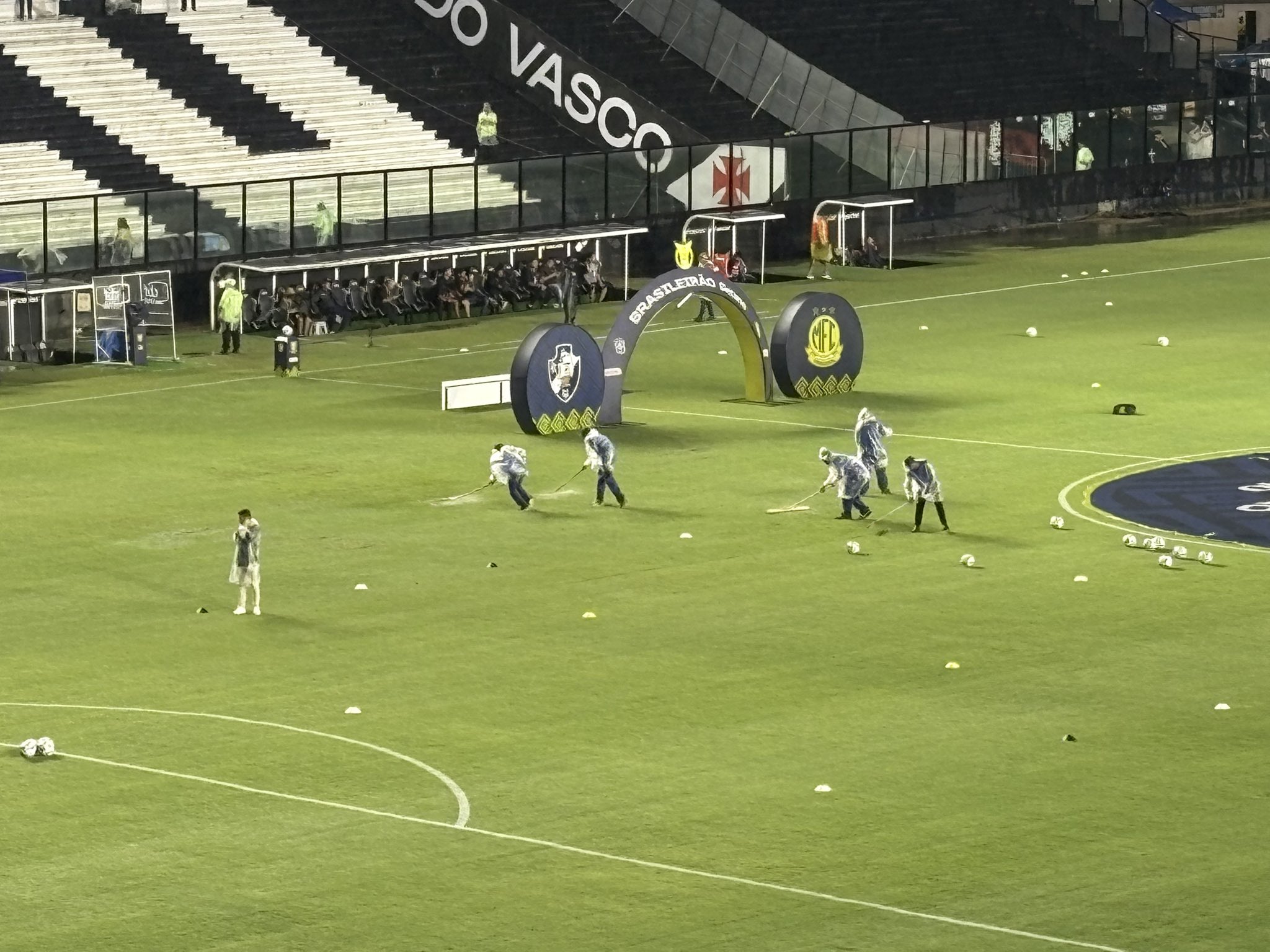 Equipe rodo: presente. Trabalho do pessoal já começou enquanto a chuva deu uma trégua aqui em São Januário. Estão tirando algumas poças para adiantar.