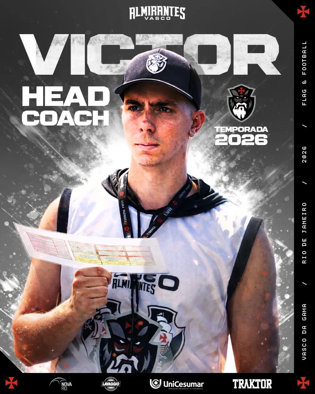 Uma trajetória construída dentro do Vasco Almirantes: começou como Coach de WRs em 2023, evoluiu para Coordenador de Jogo Aéreo, Assistente do Head Coach e Coordenador Ofensivo, até chegar ao comando do programa.