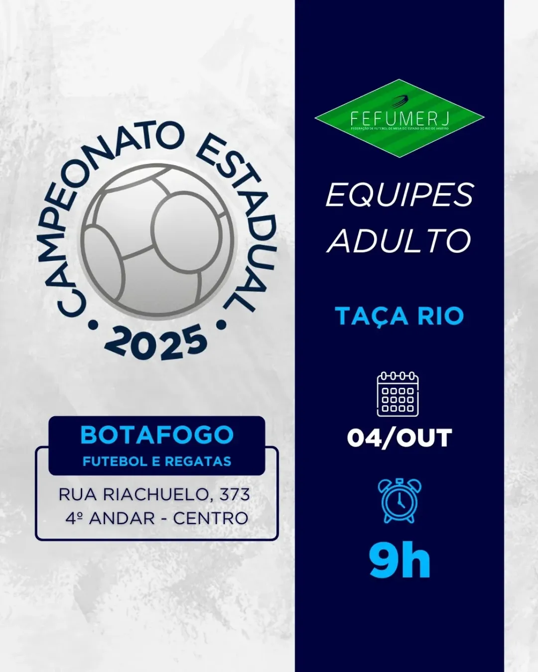 No próximo sábado, 4 de outubro, será realizada a Taça Rio de Clubes – Categoria Adulto, no CT do Botafogo Futmesa, a partir das 9h.