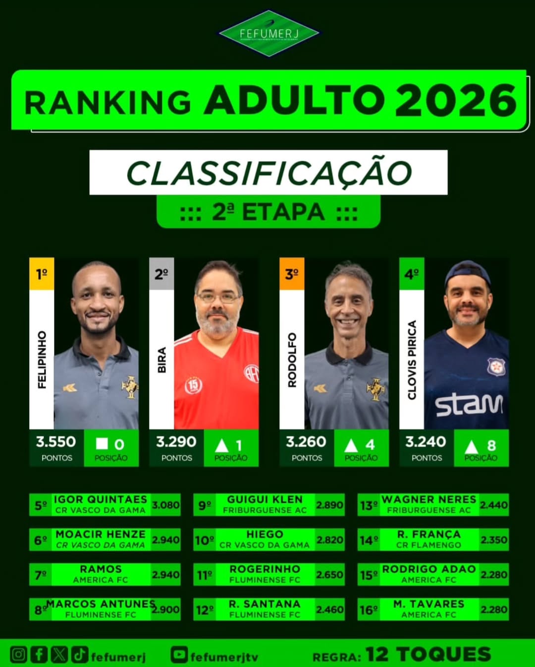 Na categoria Adulto, Felipinho aparece na liderança do ranking, seguido por Bira, do America. O Vasco também conta com Rodolfo entre os primeiros colocados, na 3ª posição, e Igor em 5º lugar.